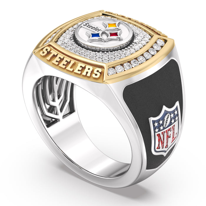 Personalize with your Custom Name and Number on this 1/2 CTTW Pittsburgh Steelers Championship Ring in 10K Yellow Gold and Sterling Silver